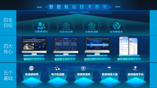 对照内河航运高质量发展目标要求,苏北运河在效率、安全和服务3个方面开启了智能航运创新实践,通过设施升级、管理优化、技术赋能和系统协同等多个维度进行系统性、一体化创新,全面构建“五个一”基础和“四大核心”系统的技术框架,着力实现“全要素感知、全智能调度、全自动运行和全伴随服务”的全方位突破,驱动船闸安全、高效自动化运行,进一步提升京杭运河苏北段运行效率。