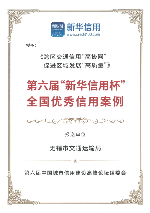 12月20日,第六届中国城市信用建设高峰论坛在内蒙古呼和浩特举办。开幕式上正式公布了第六届“新华信用杯”全国优秀信用案例征集活动评选结果,无锡市交通运输局牵头报送的《跨区交通信用“高协同”,促进区域发展“高质量”》成功获评“全国优秀信用案例”。
