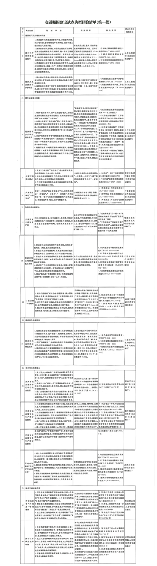 14项典型经验分别是:提升大跨径桥梁建造能力、创新高速公路集中养护理念、创新跨境多式联运服务模式、创新空铁联运模式、实施铁水联运“一单到底”、实施高速公路智慧扩容、建设京杭运河智慧航运系统、打造公路“长寿路面”、推动京杭运河航运绿色发展、开展平安交通跨部门联合安全监管、开展交通运输安全生产数字化管理、打造内河船闸“平安百年品质工程”、构建江苏省“大交通”管理体制、推动江苏铁路改革创新。(具体内容详见附表)
