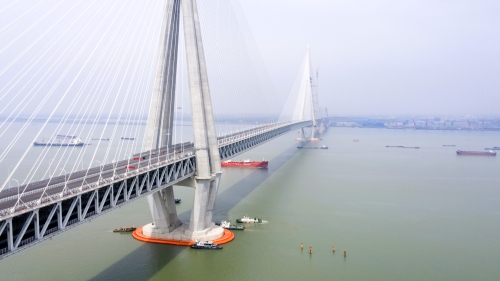 4月10日,常泰长江大桥跨江段六个涉水桥墩防撞设施全部安装完成,为长江航道的船舶通航与桥梁安全提供了双重保障。