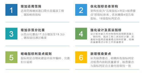 自2022年试行版印发以来,我省已连续三年持续改进评价标准,建立了动态修订机制。本次修订重点包括:适用范围增加港口筒仓及疏浚工程;整体架构在“五级指标+判定”的基础上增加核查要点;强化设计、质量关键指标要求。