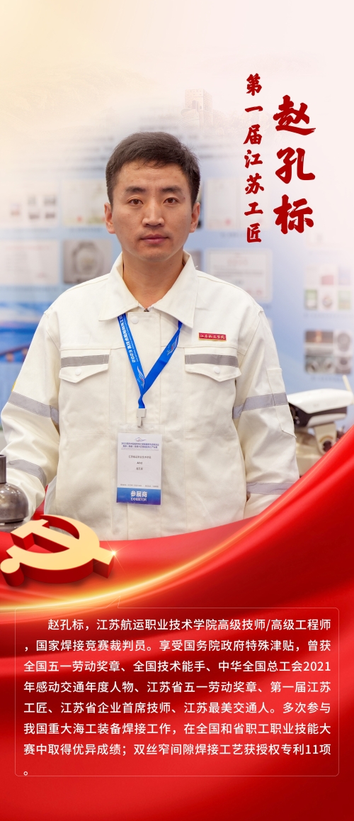 赵孔标,江苏航运职业技术学院高级技师/高级工程师,国家焊接竞赛裁判员。享受国务院政府特殊津贴,曾获全国五一劳动奖章、全国技术能手、中华全国总工会2021年感动交通年度人物、江苏省五一劳动奖章、第一届江苏工匠、江苏省企业首席技师、江苏最美交通人。多次参与我国重大海工装备焊接工作,在全国和省职工职业技能大赛中取得优异成绩;双丝窄间隙焊接工艺获授权专利11项。