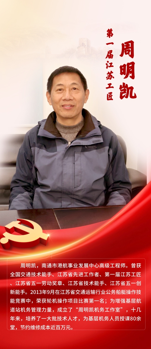 周明凯,南通市港航事业发展中心高级工程师。曾获全国交通技术能手、江苏省先进工作者、第一届江苏工匠、江苏省五一劳动奖章、江苏省技术能手、江苏省五一创新能手。2013年9月在江苏省交通运输行业公务船艇操作技能竞赛中,荣获轮机操作项目比赛第一名;为增强基层航道站机务管理力量,成立了“周明凯机务工作室”,十几年来,培养了一大批技术人才,为基层机务人员授课80余堂,节约维修成本近百万元。