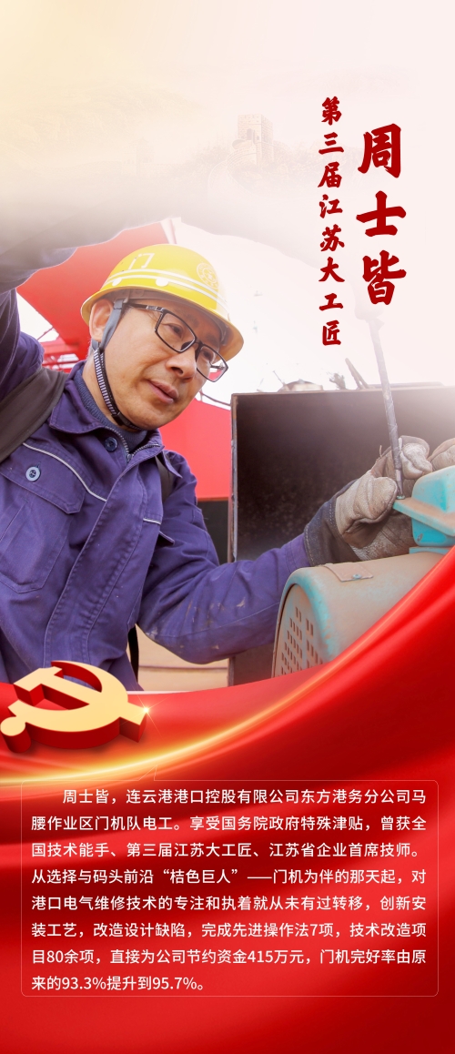 周士皆,连云港港口控股有限公司东方港务分公司马腰作业区门机队电工。享受国务院政府特殊津贴,曾获全国技术能手、第三届江苏大工匠、江苏省企业首席技师。从选择与码头前沿“桔色巨人”——门机为伴的那天起,对港口电气维修技术的专注和执着就从未有过转移,创新安装工艺,改造设计缺陷,完成先进操作法7项,技术改造项目80余项,直接为公司节约资金415万元,门机完好率由原来的93.3%提升到95.7%。