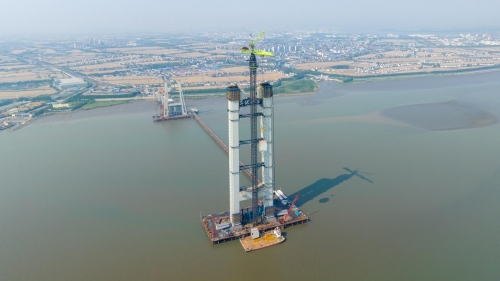 5月26日,张靖皋长江大桥南航道桥南主塔中横梁合龙,大桥中塔柱施工全部完成,南航道桥主塔建设全面进入上塔柱施工阶段。