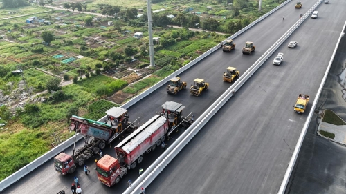 本次首件施工段位于南引线左幅,全长420米,路面宽15.05米,设计厚度为4厘米,消耗沥青混合料约630吨。为确保此次沥青首件摊铺优质高效完成,施工过程中,采用2台摊铺机摊铺,6台双钢轮压路机协同作业,对沥青混合料的拌和、运输、摊铺、碾压等各环节进行全流程管控,确保路面达到规定的压实度和平整度。